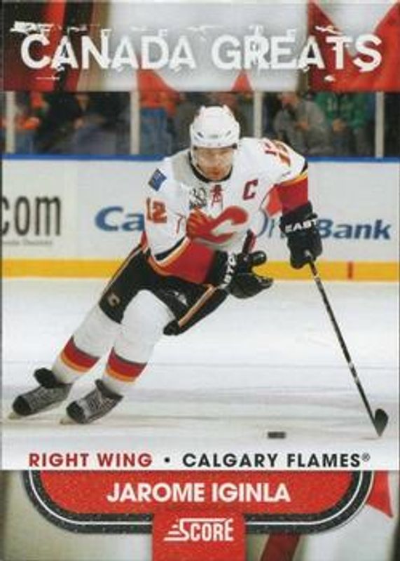 The Jarome Iginla 2010 Score #4 Canada Greats card is 1 of 8 Jarome Iginla's card variations in the 2010 Score set being tracked by Sports Card Investor, including Base, 20th Anniversary, French Back, Glossy, and Franchise.