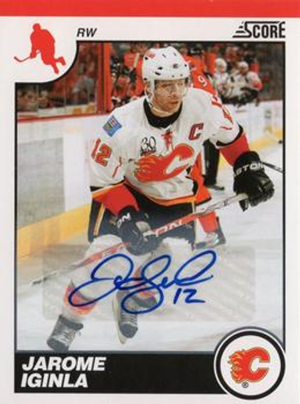 The Jarome Iginla 2010 Score #96 Signatures card is 1 of 8 Jarome Iginla's card variations in the 2010 Score set being tracked by Sports Card Investor, including Base, 20th Anniversary, French Back, Glossy, and Canada Greats.