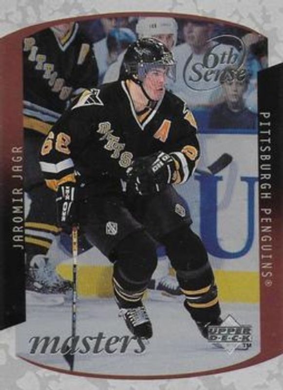 The Jaromir Jagr 1997 Upper Deck #SS2 Sixth Sense Masters /2000 card is 1 of 10 Jaromir Jagr's card variations in the 1997 Upper Deck set being tracked by Sports Card Investor, including Base, Game Dated, Box Toppers, Series Two Jumbo, and Smooth Grooves.