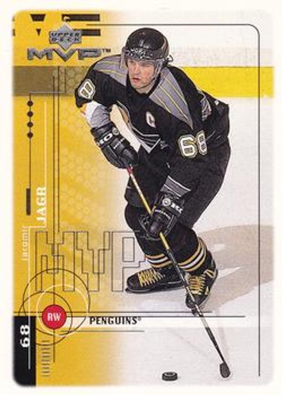 The Jaromir Jagr 1998 Upper Deck MVP #163 Base card is 1 of 7 Jaromir Jagr's card variations in the 1998 Upper Deck MVP set being tracked by Sports Card Investor, including Silver Script, Gold Script /100, Super Script /25, OT Heroes, and Power Game.