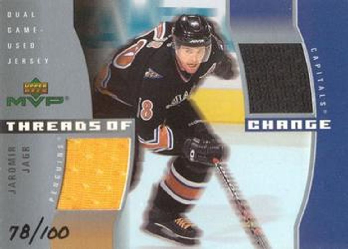 The Jaromir Jagr 2003 Upper Deck MVP #TC7 Threads Of Change /100 card is 1 of 9 Jaromir Jagr's card variations in the 2003 Upper Deck MVP set being tracked by Sports Card Investor, including Base, Silver Script /150, Gold Script /25, Red Script /25, and MVP Souvenirs.
