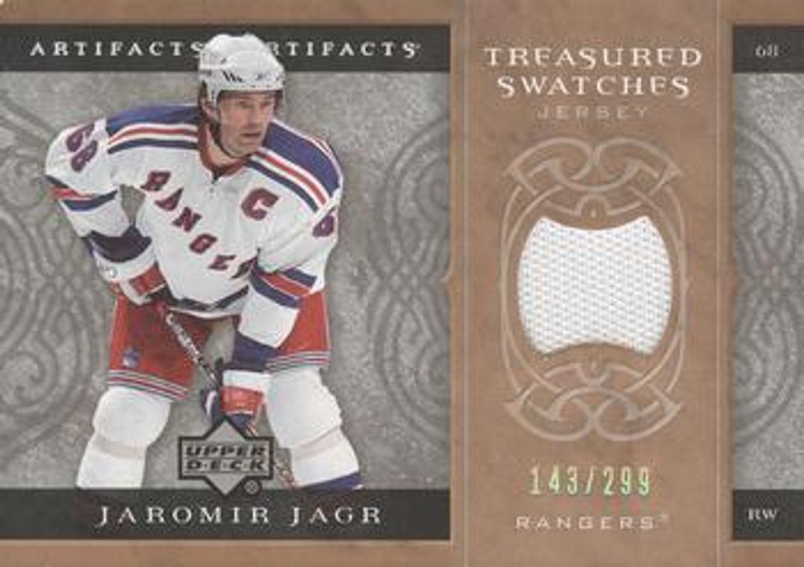 The Jaromir Jagr 2007 Upper Deck Artifacts #TS-JJ Treasured Swatches /299 card is 1 of 22 Jaromir Jagr's card variations in the 2007 Upper Deck Artifacts set being tracked by Sports Card Investor, including #127 Base /599, #19 Base /599, #127 Silver /100, #19 Silver /100, and #19 Gold /50.