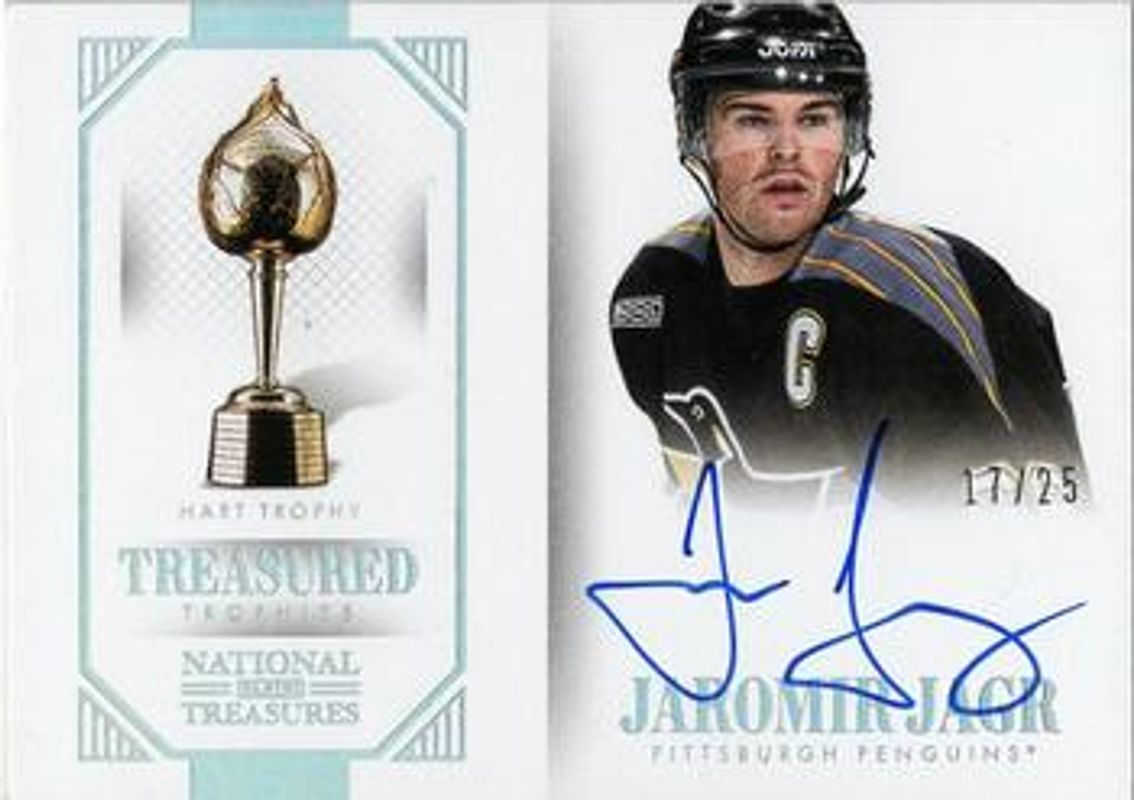 The Jaromir Jagr 2013 National Treasures #H-JJ Treasured Trophies Autographs Hart /25 card is 1 of 56 Jaromir Jagr's card variations in the 2013 National Treasures set being tracked by Sports Card Investor, including Base /99, Gold /25, Silver /25, Emerald /5, and Black /1.
