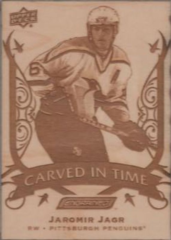The Jaromir Jagr 2019 Upper Deck Engrained #CT-22 Carved in Time card is 1 of 9 Jaromir Jagr's card variations in the 2019 Upper Deck Engrained set being tracked by Sports Card Investor, including Base /299, Ebony /49, Mahogany /10, Rosewood /1, and Updates - Signatures Flexures.