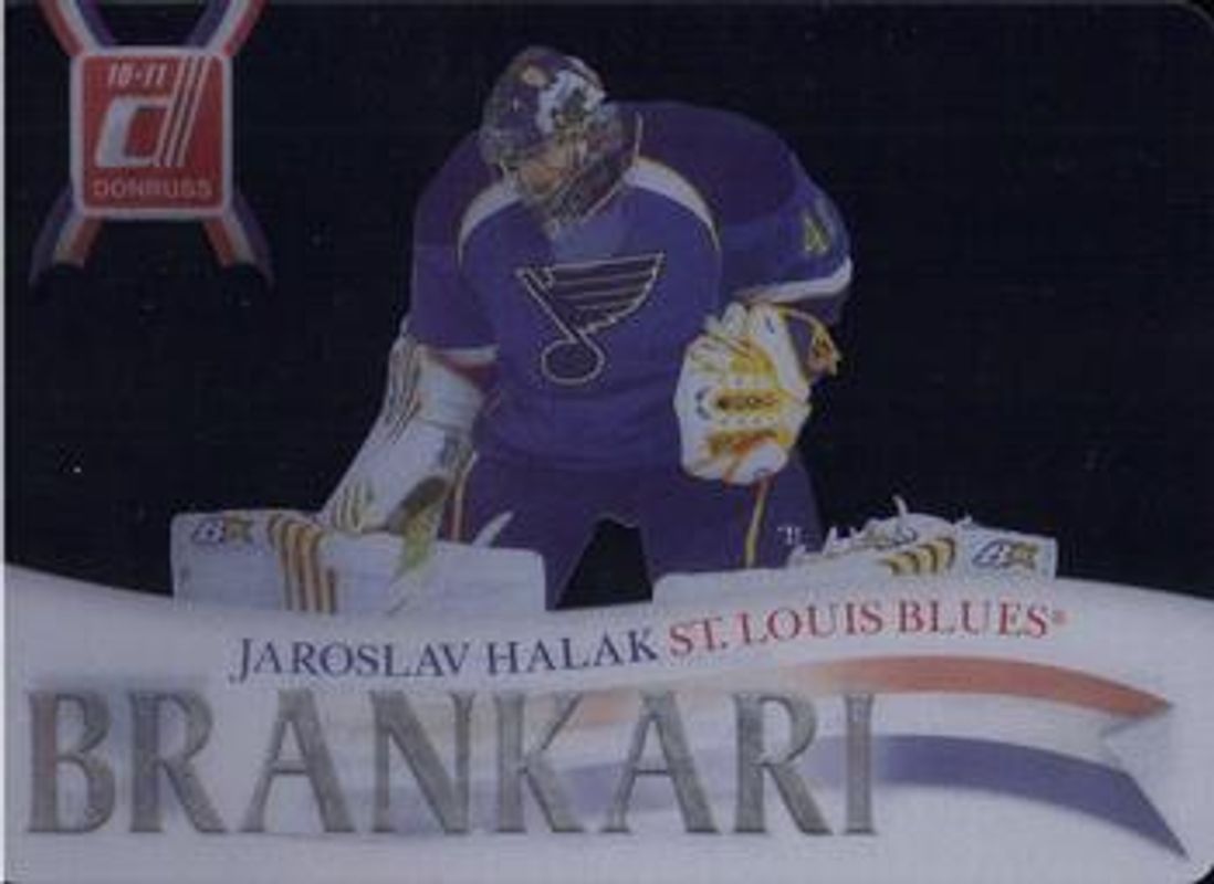 The Jaroslav Halak 2010 Donruss #15 Les Gardiens card is 1 of 6 Jaroslav Halak's card variations in the 2010 Donruss set being tracked by Sports Card Investor, including Base, Press Proofs /100, The Ultimate Draft, die-cut Gems /30, and die-cut Gems Autographs /25.