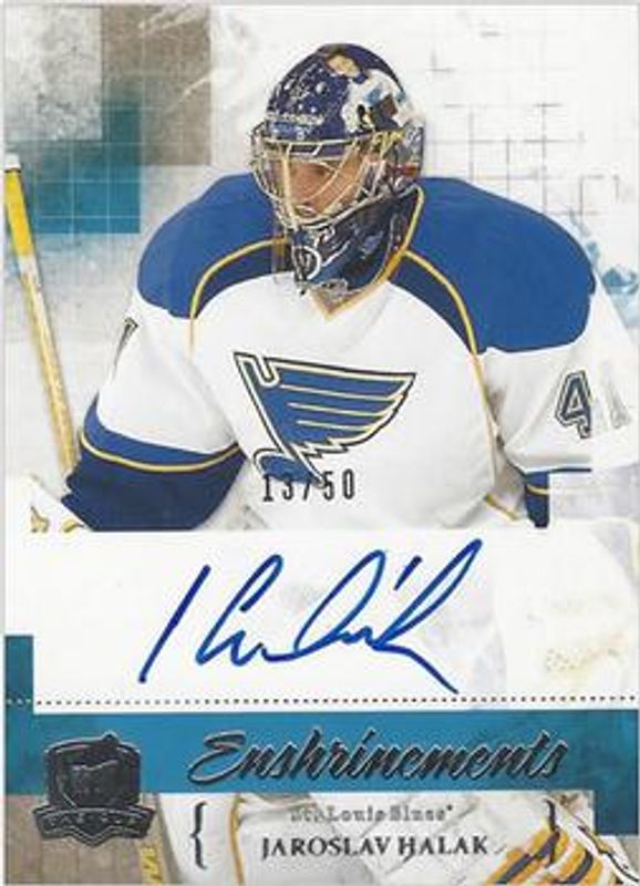 The Jaroslav Halak 2010 Upper Deck The Cup #CE-JH Enshrinements /50 card is 1 of 18 Jaroslav Halak's card variations in the 2010 Upper Deck The Cup set being tracked by Sports Card Investor, including Base /199, Gold /25, Gold Rainbow /25, Black /1, and Printing Plates Black /1.