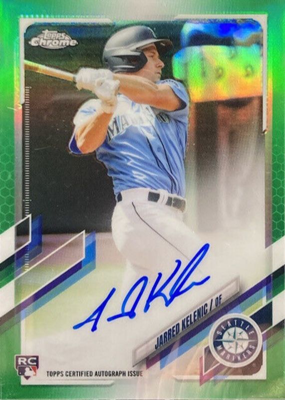 The Jarred Kelenic 2021 Topps Chrome #RA-JKE Rookie Auto - Green Refractor /99 card in Raw condition has not changed in price in the last 30 days and was last sold for $35.00 .