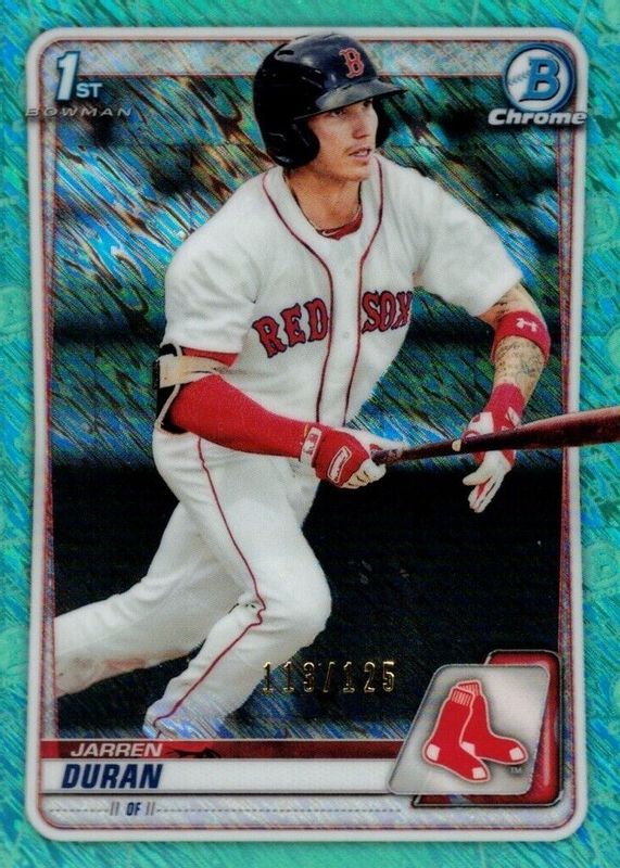 The Jarren Duran 2020 Bowman #BCP-144 Chrome Prospects - Aqua Shimmer Refractor /125 (1st) card in Raw condition has not changed in price in the last 30 days and was last sold for $50.00 .