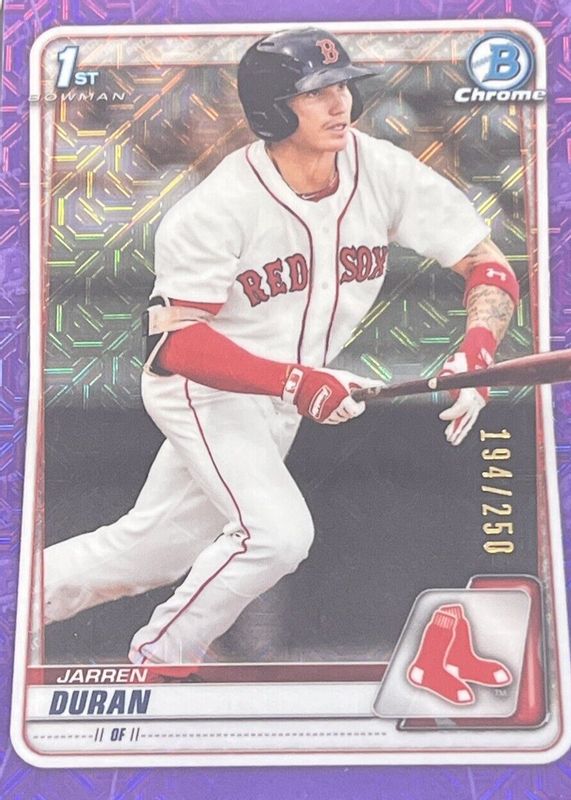 The Jarren Duran 2020 Bowman #BCP-144 Chrome Prospects - Purple Refractor /250 (1st) card in Raw condition has not changed in price in the last 30 days and was last sold for $19.99 .