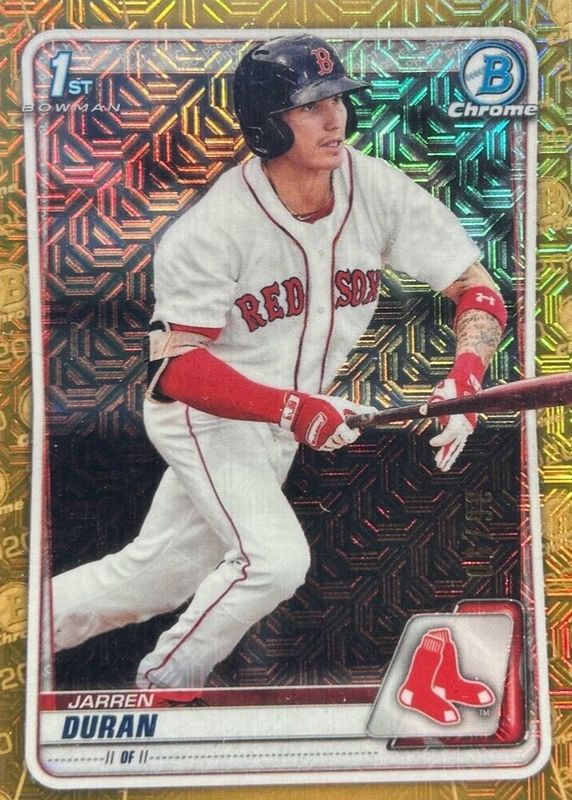 This card is 1 of 12 Jarren Duran's card variations in the 2020 Bowman Mega Box set being tracked by Sports Card Investor, including Chrome Prospects - Mojo Refractor (1st), Chrome Prospects Photo Variation - Mojo Refractor, Chrome Prospects - Purple Mojo Refractor /250 (1st), Chrome Prospects - Pink Mojo Refractor /199 (1st), and Chrome Prospects - Blue Mojo Refractor /150 (1st).