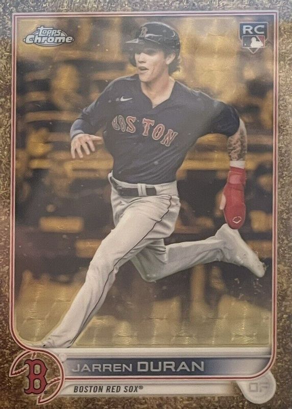 This card is 1 of 10 Jarren Duran's card variations in the 2022 Topps Gilded Collection set being tracked by Sports Card Investor, including Base /99, Mini-Diamond Gold Etch Refractor /50, RayWave Gold Etch Refractor /25, Lava Gold Etch Refractor /10, and Topps Chrome Gold Etch Autographs /99.