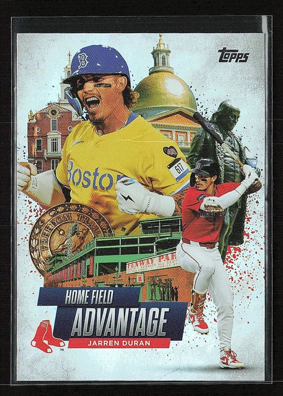 The Jarren Duran 2025 Topps #HA-24 Homefield Advantage card is 1 of 275 Jarren Duran's card variations in the 2025 Topps set being tracked by Sports Card Investor, including #312 Base, #587 Base, #312 Aqua Holo Foil, #587 Aqua Holo Foil, and #587 Diamante Foil.