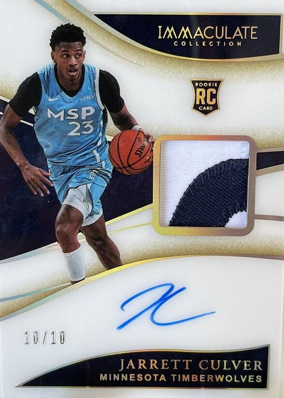 The Jarrett Culver 2019 Immaculate #127 Rookie Patch Auto - Gold /10 card in Raw condition has not changed in price in the last 30 days and was last sold for $200.00 .