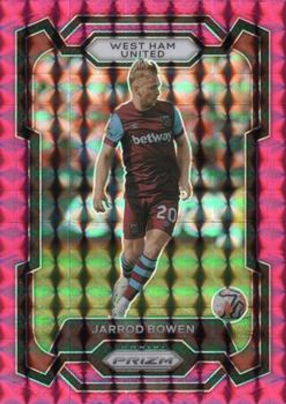 The Jarrod Bowen 2023 Prizm Premier League #215 Pink Mosaic card is 1 of 85 Jarrod Bowen's card variations in the 2023 Prizm Premier League set being tracked by Sports Card Investor, including Base, Blue Mosaic, Breakaway, Breakaway Orange, and Choice.