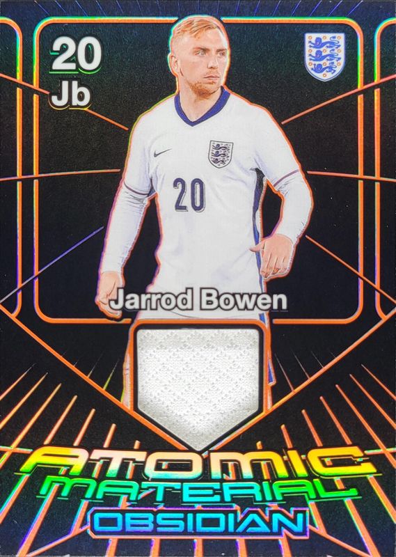 The Jarrod Bowen 2024 Obsidian #AM-JB Atomic Material - Electric Etch Orange /99 card is 1 of 9 Jarrod Bowen's card variations in the 2024 Obsidian set being tracked by Sports Card Investor, including Atomic Material /199, Atomic Material - Electric Etch Purple /50, Atomic Material - Electric Etch Red Pulsar /49, Atomic Material - Electric Etch Taiga /25, and Atomic Material - Electric Etch Gold Flood /10.