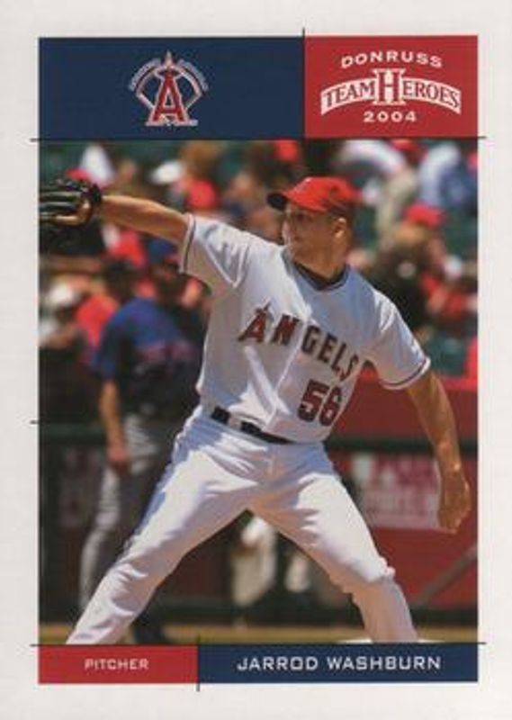 The Jarrod Washburn 2004 Donruss Team Heroes #4 Base card is 1 of 4 Jarrod Washburn's card variations in the 2004 Donruss Team Heroes set being tracked by Sports Card Investor, including Showdown - Bronze /150, Showdown - Silver /50, and Showdown - Gold /10.