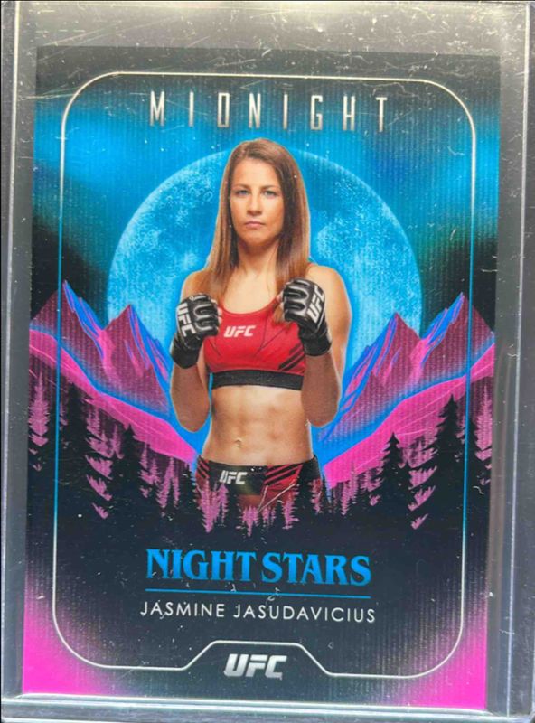 The Jasmine Jasudavicius 2024 Topps Midnight UFC #NS-25 Night Stars Rookie card is 1 of 24 Jasmine Jasudavicius' card variations in the 2024 Topps Midnight UFC set being tracked by Sports Card Investor, including Base, Moon Beam, Morning /125, Twilight /99, and Dusk /75.