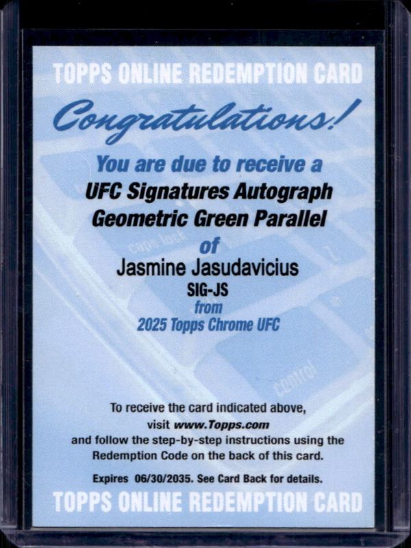 The Jasmine Jasudavicius 2025 Topps Chrome UFC #SIG-JS UFC Signatures - Green Geometric Refractor /99 card is 1 of 50 Jasmine Jasudavicius' card variations in the 2025 Topps Chrome UFC set being tracked by Sports Card Investor, including Base, Geometric Refractor, Negative Refractor, Prism Refractor, and Purple Refractor.