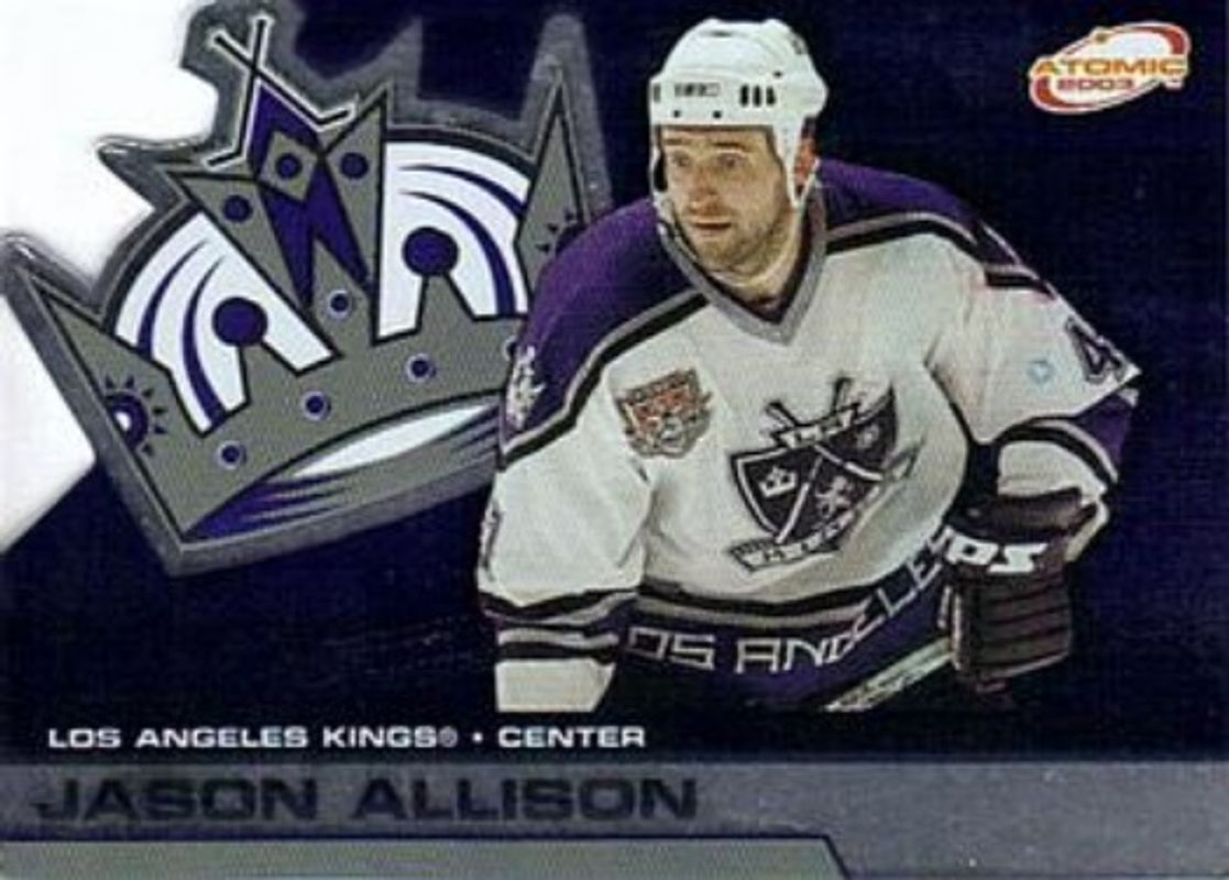 The Jason Allison 2002 Pacific Atomic #48 Base /1300 card is 1 of 7 Jason Allison's card variations in the 2002 Pacific Atomic set being tracked by Sports Card Investor, including Hobby Parallel /775, Blue /175, Red /125, Gold /99, and Power Converters.