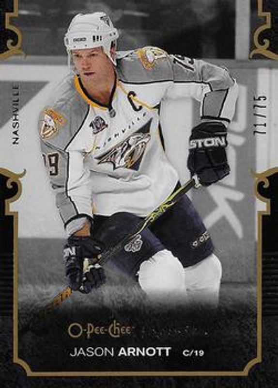 The Jason Arnott 2007 O-Pee-Chee Premier #93 Gold /50 card is 1 of 11 Jason Arnott's card variations in the 2007 O-Pee-Chee Premier set being tracked by Sports Card Investor, including Base /299, Silver Spectrum /35, Gold Spectrum /15, Black /1, and Remnants Triples /100.