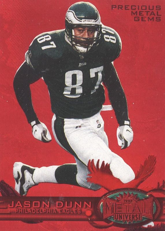 This card is 1 of 2 Jason Dunn's card variations in the 1997 Metal Universe set being tracked by Sports Card Investor, including Precious Metal Gems Green /15.