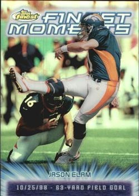 The Jason Elam 2000 Topps Finest #FM18 Finest Moments - Refractor card is 1 of 3 Jason Elam's card variations in the 2000 Topps Finest set being tracked by Sports Card Investor, including Finest Moments, and Finest Moments - Refractor Autograph.
