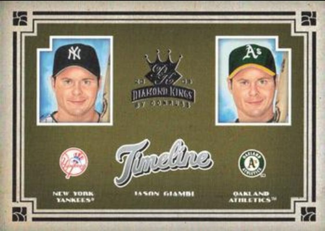 The Jason Giambi 2005 Diamond Kings #T-21 Timeline card is 1 of 64 Jason Giambi's card variations in the 2005 Diamond Kings set being tracked by Sports Card Investor, including Base, Black & White, Framed Red, Framed Red Black & White, and Non Canvas.