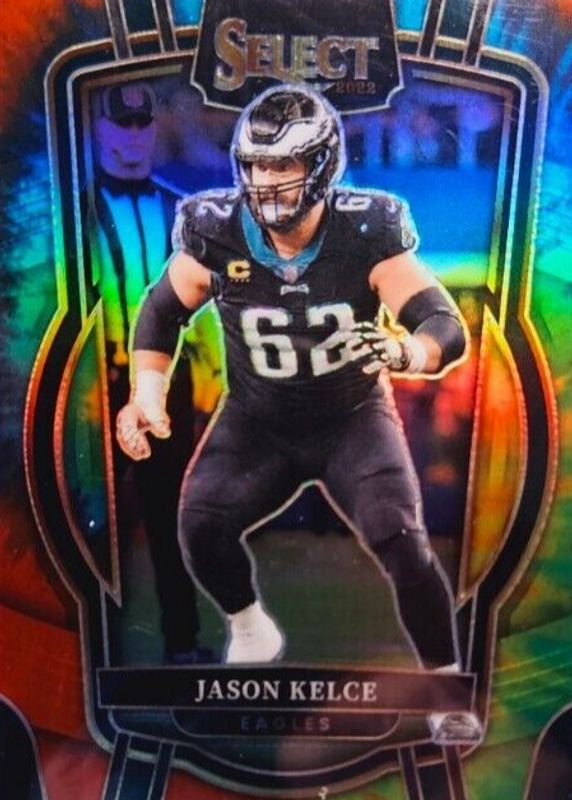 This card is 1 of 30 Jason Kelce's card variations in the 2022 Select set being tracked by Sports Card Investor, including Club Level Neon Green Die-Cut /299, Club Level Orange Die-Cut /199, Club Level Tri-Color /149, Club Level Blue /99, and Club Level Copper Die-Cut /99.