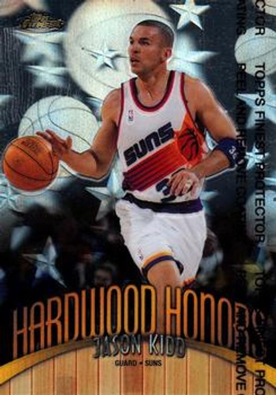 The Jason Kidd 1998 Topps Finest #H15 Hardwood Honors card is 1 of 5 Jason Kidd's card variations in the 1998 Topps Finest set being tracked by Sports Card Investor, including Base, Base - No Coating, Refractor, and Refractor - No Coating.
