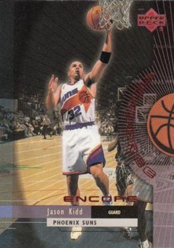 The Jason Kidd 1999 Upper Deck Encore #J9 Jamboree card is 1 of 5 Jason Kidd's card variations in the 1999 Upper Deck Encore set being tracked by Sports Card Investor, including Base /1999, Electric Currents, Game Jerseys, and Electric Currents F X /150.