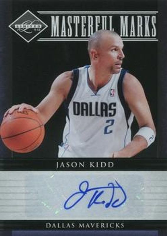 The Jason Kidd 2011 Limited #25 Masterful Marks Signatures /50 card is 1 of 16 Jason Kidd's card variations in the 2011 Limited set being tracked by Sports Card Investor, including Base /299, Silver Spotlight /49, Gold Spotlight /25, National Convention VIP /5, and Platinum Spotlight /1.