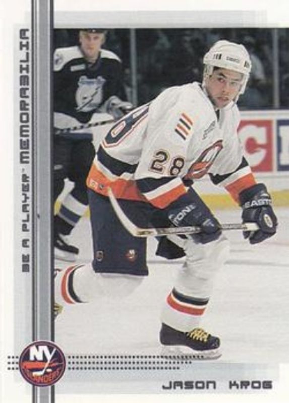 The Jason Krog 2000 In The Game Be a Player Memorabilia #392 Base Rookie card is 1 of 22 Jason Krog's card variations in the 2000 In The Game Be a Player Memorabilia set being tracked by Sports Card Investor, including Promos, Ruby /200, Sapphire /100, Chicago Sportsfest Blue /10, and Chicago Sportsfest Copper /10.