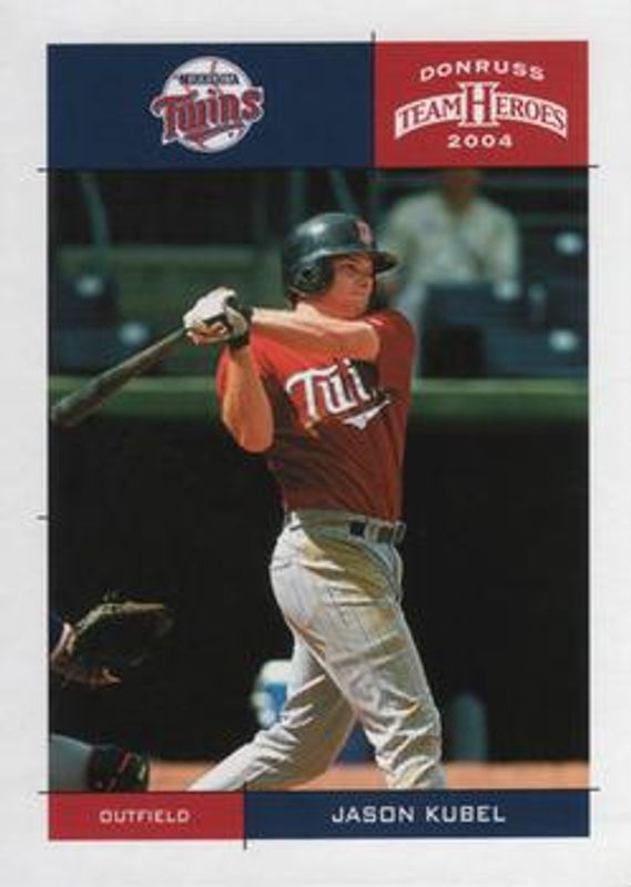The Jason Kubel 2004 Donruss Team Heroes #246 Base card is 1 of 5 Jason Kubel's card variations in the 2004 Donruss Team Heroes set being tracked by Sports Card Investor, including Showdown - Bronze /150, Showdown - Silver /50, Showdown - Gold /10, and Autographs /10.
