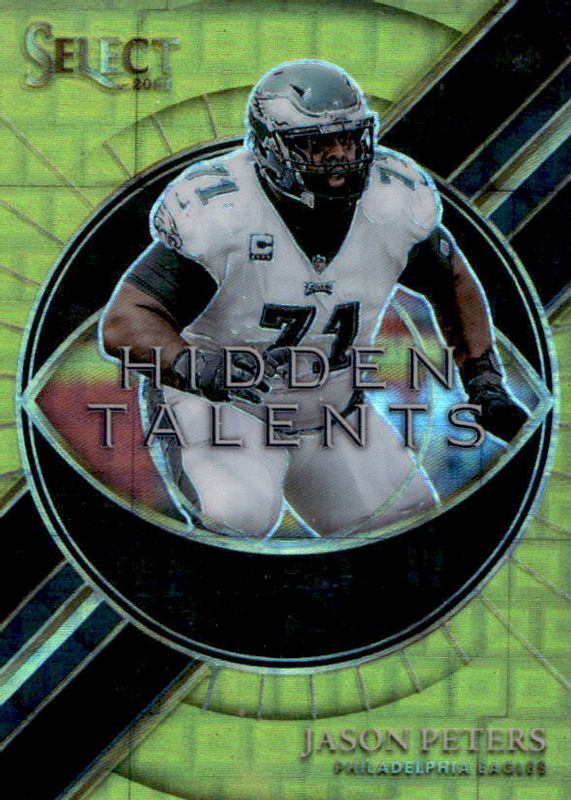 This card is 1 of 7 Jason Peters' card variations in the 2021 Select set being tracked by Sports Card Investor, including Hidden Talents - Silver, Hidden Talents - Zebra /(SSP), Hidden Talents - Tie-Dye /25, Hidden Talents - Green /5, and Hidden Talents - Green & Black Snakeskin /2.