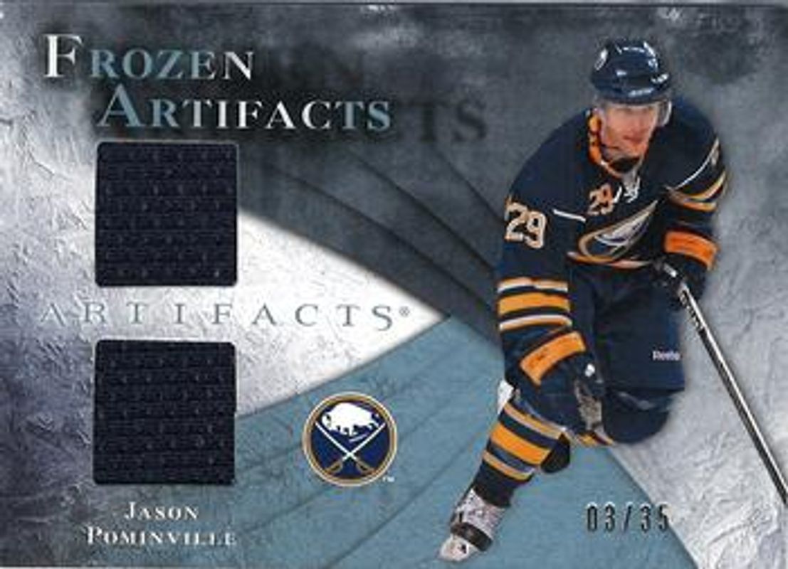 The Jason Pominville 2010 Upper Deck Artifacts #FA-JP Frozen Artifacts Blue /35 card is 1 of 22 Jason Pominville's card variations in the 2010 Upper Deck Artifacts set being tracked by Sports Card Investor, including Frozen Artifacts Retail, Treasured Swatches Retail, Frozen Artifacts /150, Treasured Swatches /150, and Frozen Artifacts Jersey Patch Blue /50.