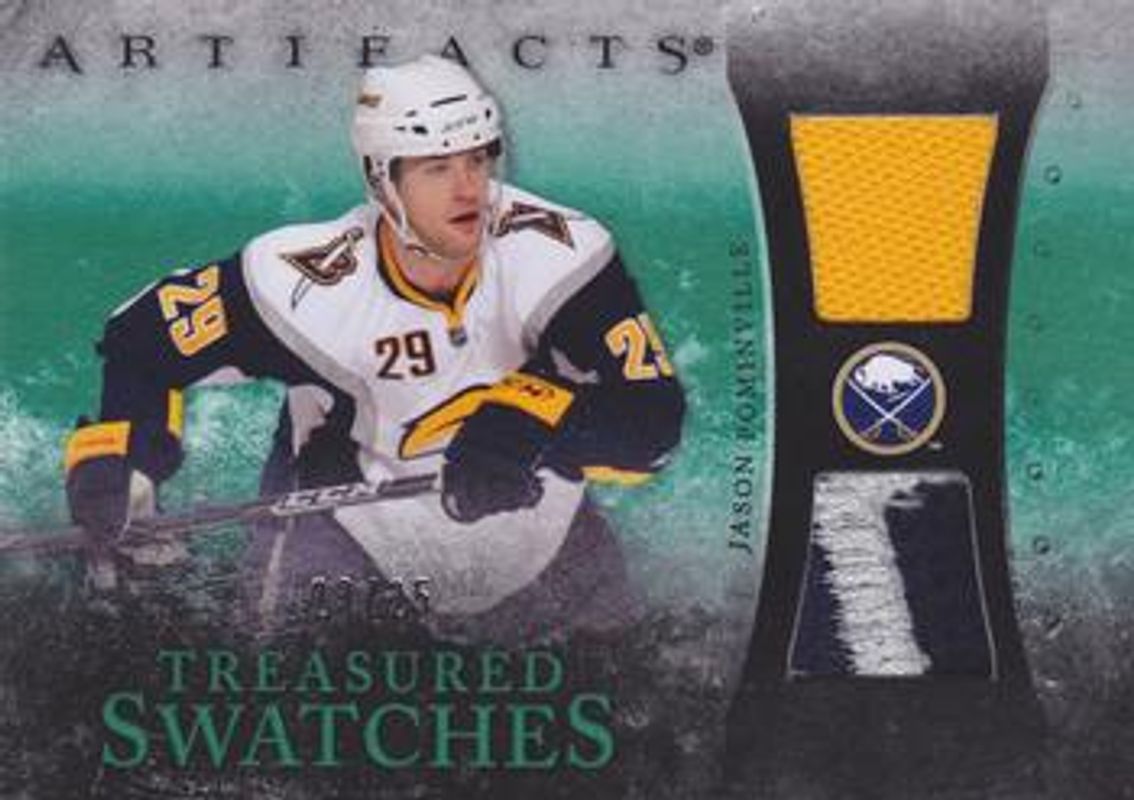 The Jason Pominville 2010 Upper Deck Artifacts #TS-JP Treasured Swatches Jersey Patch - Emerald /25 card is 1 of 22 Jason Pominville's card variations in the 2010 Upper Deck Artifacts set being tracked by Sports Card Investor, including Frozen Artifacts Retail, Treasured Swatches Retail, Frozen Artifacts /150, Treasured Swatches /150, and Frozen Artifacts Jersey Patch Blue /50.