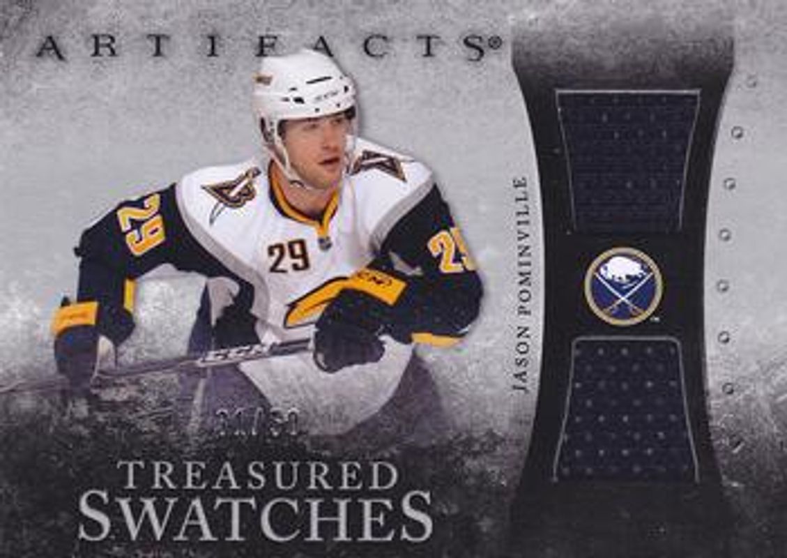 The Jason Pominville 2010 Upper Deck Artifacts #TS-JP Treasured Swatches - Silver /50 card is 1 of 22 Jason Pominville's card variations in the 2010 Upper Deck Artifacts set being tracked by Sports Card Investor, including Frozen Artifacts Retail, Treasured Swatches Retail, Frozen Artifacts /150, Treasured Swatches /150, and Frozen Artifacts Jersey Patch Blue /50.