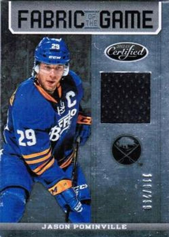 The Jason Pominville 2012 Certified #FOG-JPO Fabric of the Game /299 card is 1 of 14 Jason Pominville's card variations in the 2012 Certified set being tracked by Sports Card Investor, including Base /999, Mirror Red /100, Mirror Hot Box /75, Mirror Blue /50, and Mirror Gold /25.
