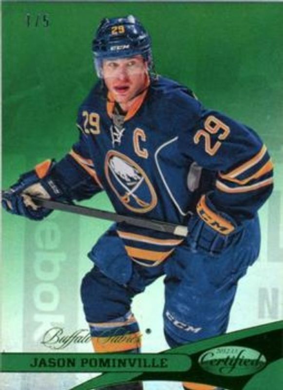 The Jason Pominville 2012 Certified #29 Mirror Emerald /5 card is 1 of 14 Jason Pominville's card variations in the 2012 Certified set being tracked by Sports Card Investor, including Base /999, Mirror Red /100, Mirror Hot Box /75, Mirror Blue /50, and Mirror Gold /25.