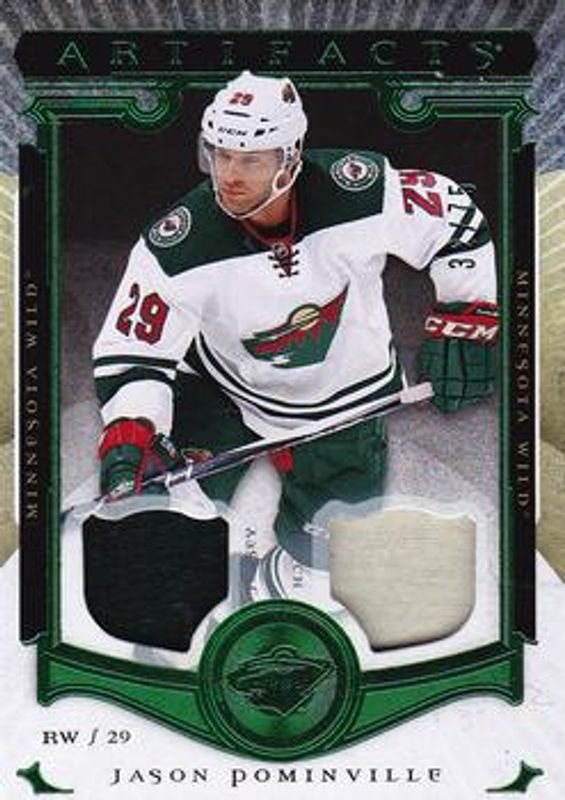 The Jason Pominville 2015 Upper Deck Artifacts #13 Material Emerald /49 card is 1 of 11 Jason Pominville's card variations in the 2015 Upper Deck Artifacts set being tracked by Sports Card Investor, including Base /899, Ruby /399, Auto Materials Silver /125, Emerald /99, and Sapphire /85.