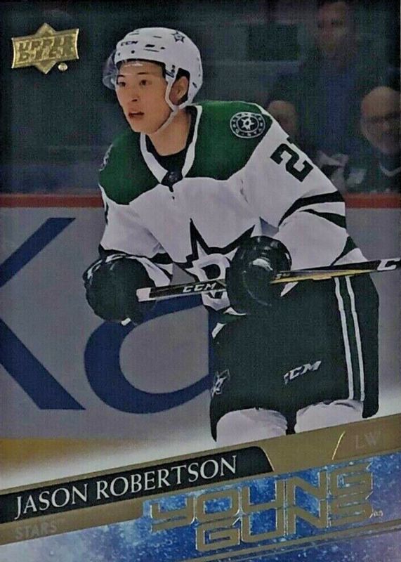 This card is 1 of 10 Jason Robertson's card variations in the 2020 Upper Deck set being tracked by Sports Card Investor, including Young Guns Base, Young Guns Canvas, Young Guns - Clear Cut, Young Guns - Clear Cut Exclusives, and Young Guns - French.