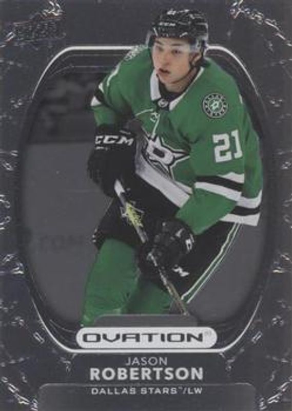The Jason Robertson 2021 Upper Deck Ovation #67 Silver Foil card is 1 of 16 Jason Robertson's card variations in the 2021 Upper Deck Ovation set being tracked by Sports Card Investor, including Base, Checkerboard, Gold Circular Wonder, Gold Foil, and Standing Ovation /500.