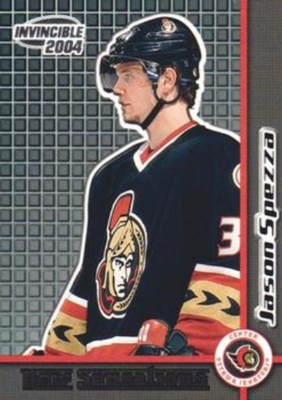 The Jason Spezza 2003 Pacific Invincible #18 New Sensations card is 1 of 6 Jason Spezza's card variations in the 2003 Pacific Invincible set being tracked by Sports Card Investor, including Base /799, Retail, Red /850, Blue /350, and Featured Performers.