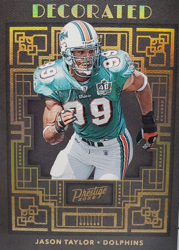 The biggest 30-day change Jason Taylor cards are 2022 Prestige #DE-30 Decorated /(SSP), 1997 SP Authentic #116 Base, and 1998 Topps Chrome #95 Refractor.