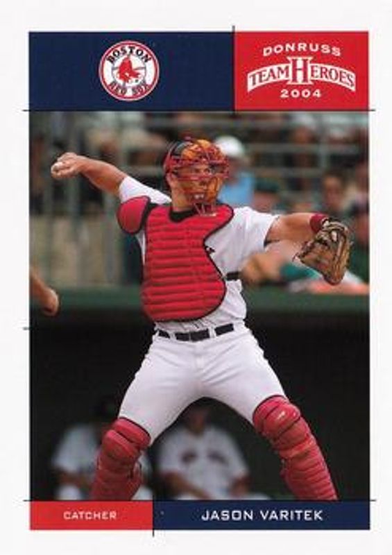 The Jason Varitek 2004 Donruss Team Heroes #56 Base card is 1 of 5 Jason Varitek's card variations in the 2004 Donruss Team Heroes set being tracked by Sports Card Investor, including Showdown - Bronze /150, Showdown - Silver /50, Showdown - Gold /10, and Autographs /10.