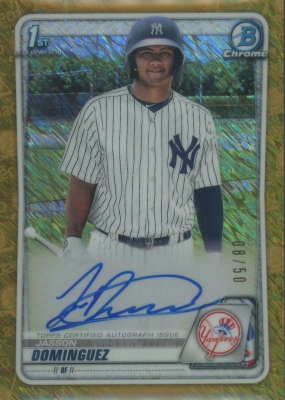 Best Prices Available For Sale of Jasson Dominguez 2020 Bowman #CPA-JDO Chrome Prospect Auto - Gold Shimmer Refractor /50 (1st)