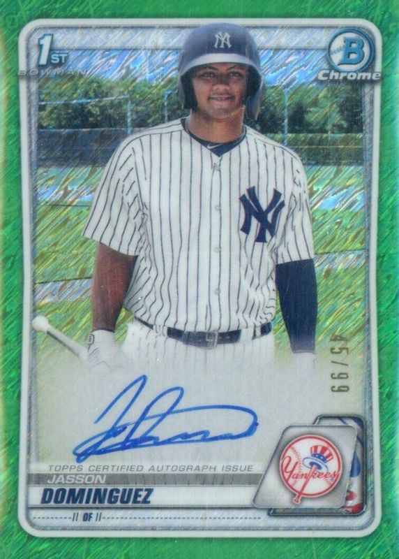 Best Prices Available For Sale of Jasson Dominguez 2020 Bowman #CPA-JDO Chrome Prospect Auto - Green Shimmer Refractor /99 (1st)