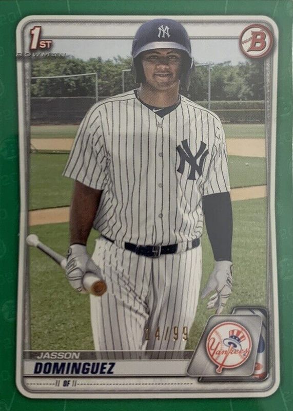 The Jasson Dominguez 2020 Bowman #BP-8 Paper Prospects - Green /99 (1st) card in Raw condition has not changed in price in the last 30 days and was last sold for $70.00 .