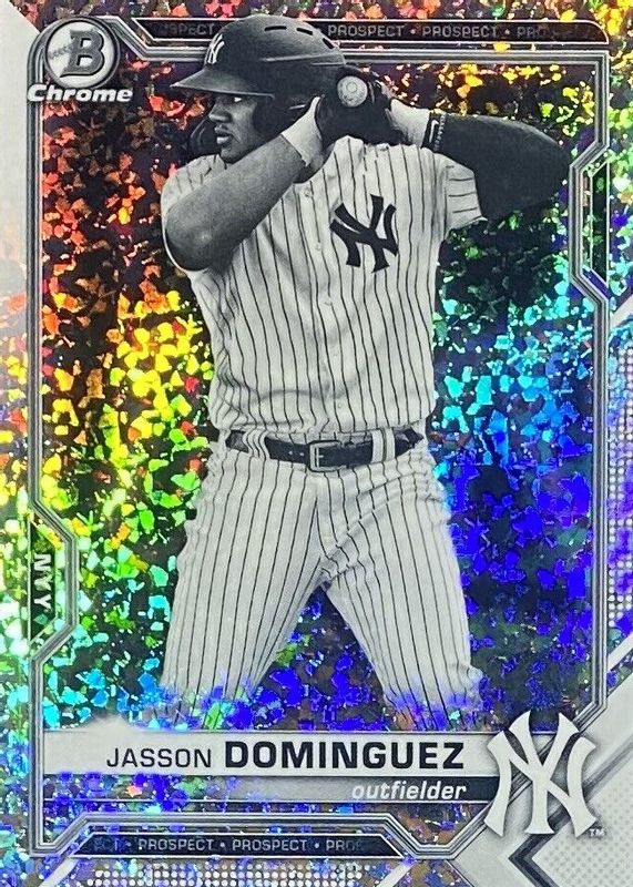 The Jasson Dominguez 2021 Bowman Chrome #BCP-213 Prospects - Black & White Mini-Diamond Refractor card in Raw condition has not changed in price in the last 30 days and was last sold for $5.50 .