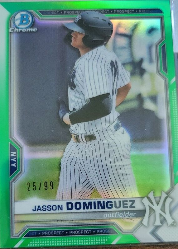 The Jasson Dominguez 2021 Bowman #BCP-13 Chrome Prospects - Green Refractor /99 card in Raw condition has not changed in price in the last 30 days and was last sold for $32.00 .